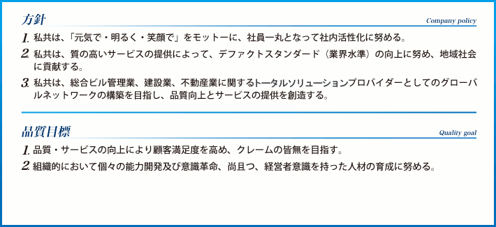 建設業許可番号 東京都知事許可(般-25)第141379号建設業を営む者として、建設業法の第一条に定められているように「建設業を営む者の資質の向上、建設工事の請負契約の適正化等を図ることによって、建設工事の適正な施工を確保し、発注者を保護するとともに、建設業の健全な発達を促進し、もって公共の福祉の増進に寄与する」ことを遵守し、信頼と感謝を理念として事業活動を行っています。