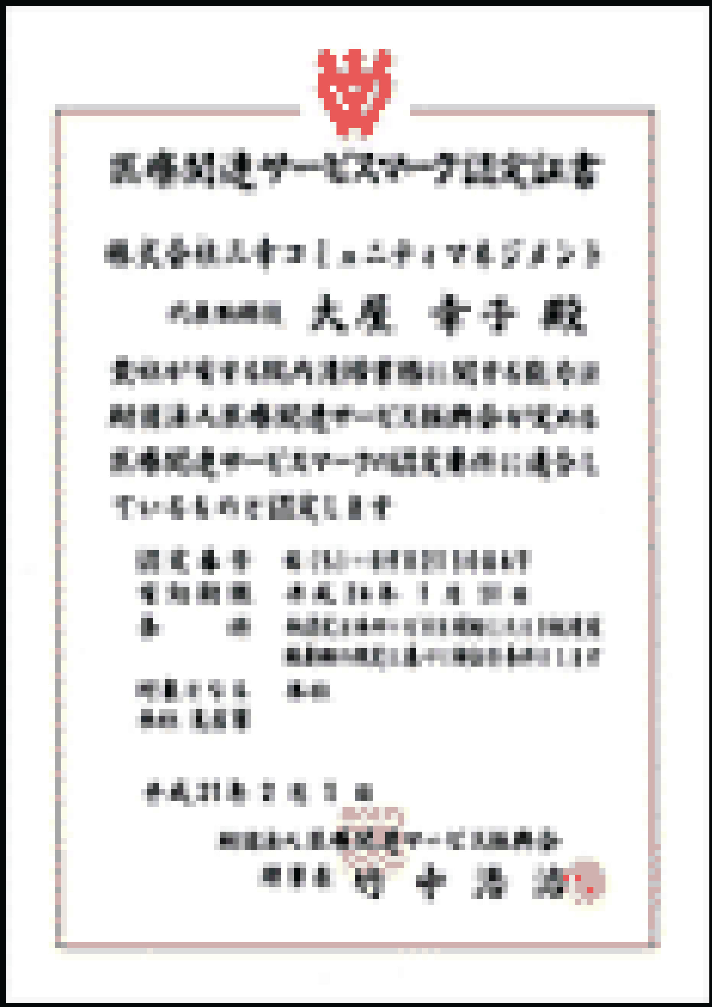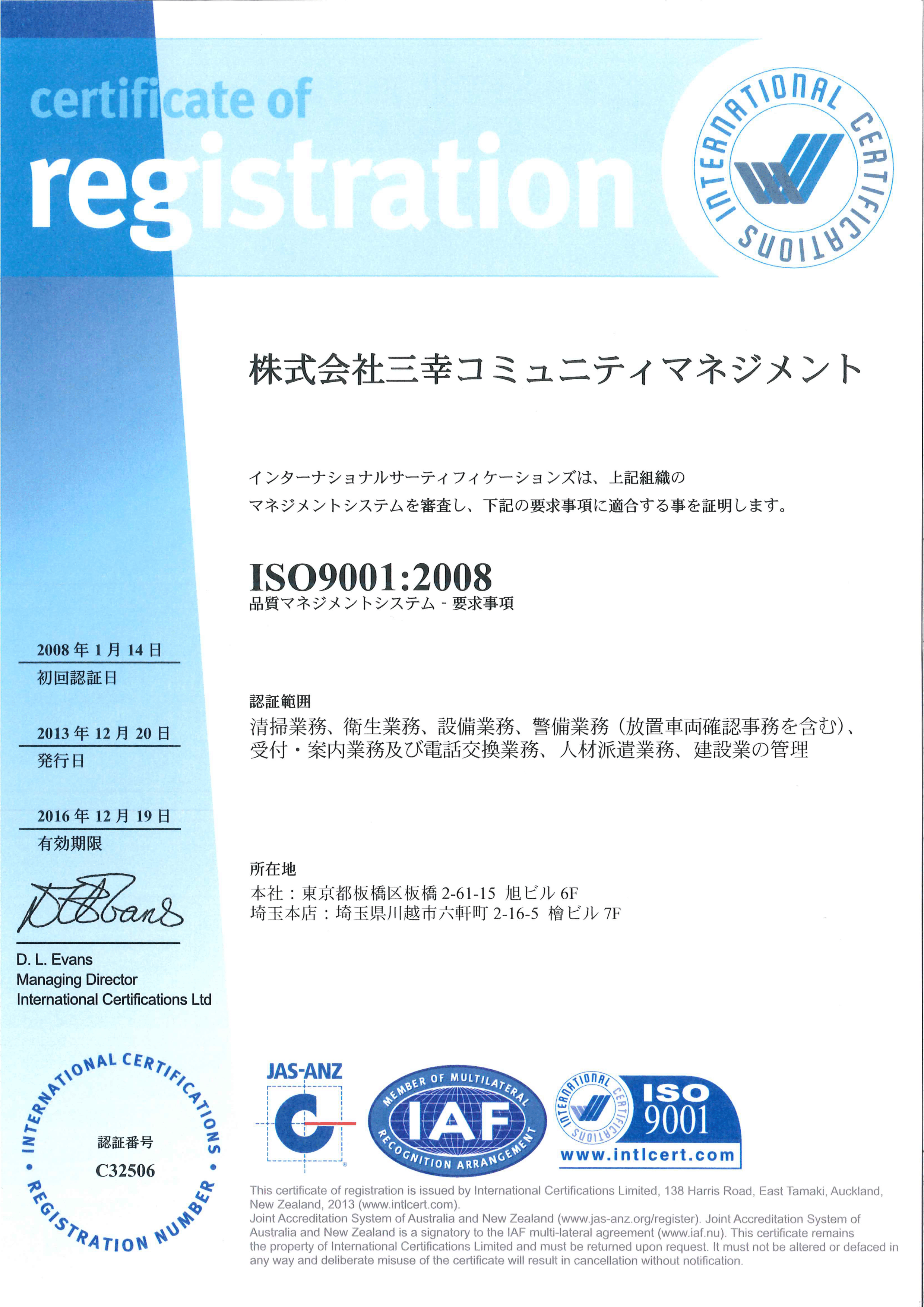 国際標準化機構であるISO。中でもISO9001は単に良い製品(サービス)を作るためだけではなく良い製品(サービス)を作り、お客様に提供するためのシステムを管理することです。三幸コミュニティマネジメントは2003年11月にISO9001を取得しました。私どもでは高品質を保つためのマネジメントシステムを設け、受注からサービスの提供まで厳しい管理体制のなかで業務を行っています。また、お客様のご要望にはどんな些細なことも受け止め、更なるサービスの向上を図っています。